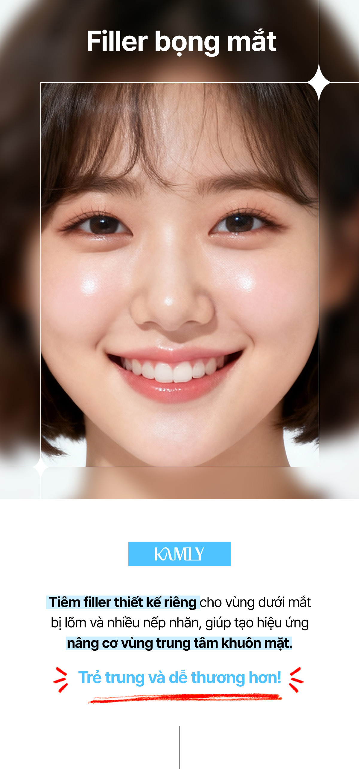 Khi cười có thể tạo hiệu ứng bọng mắt cười dễ thương. Thủ thuật được thực hiện thoải mái với kem gây tê tại chỗ, sau đó tiêm filler mềm bằng cannula hoặc kim tiêm.