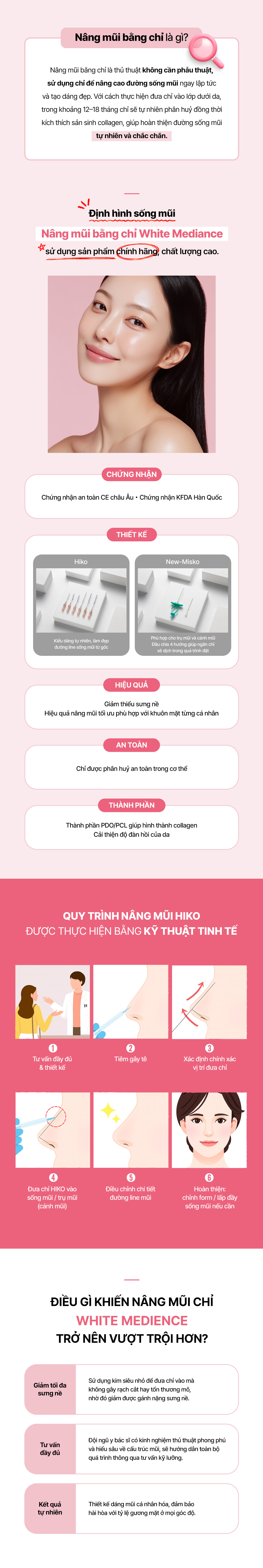 Đây là phương pháp đưa các loại chỉ đặc biệt (PDO, PLLA, PCL, v.v.) vào sống mũi để tạo trụ nâng, làm mũi cao và thon gọn hơn, giúp cải thiện dáng mũi mà không cần phẫu thuật.