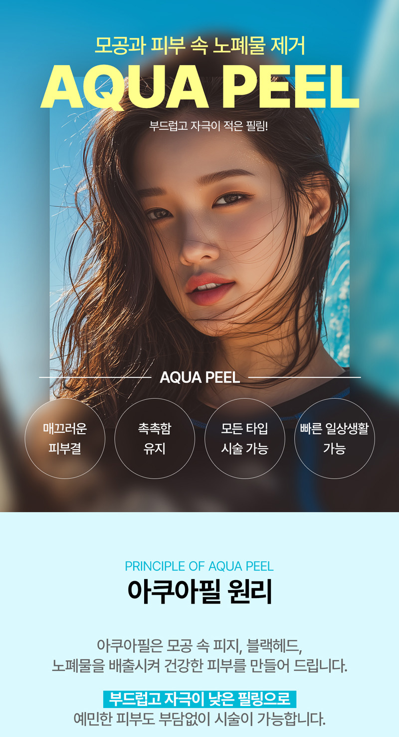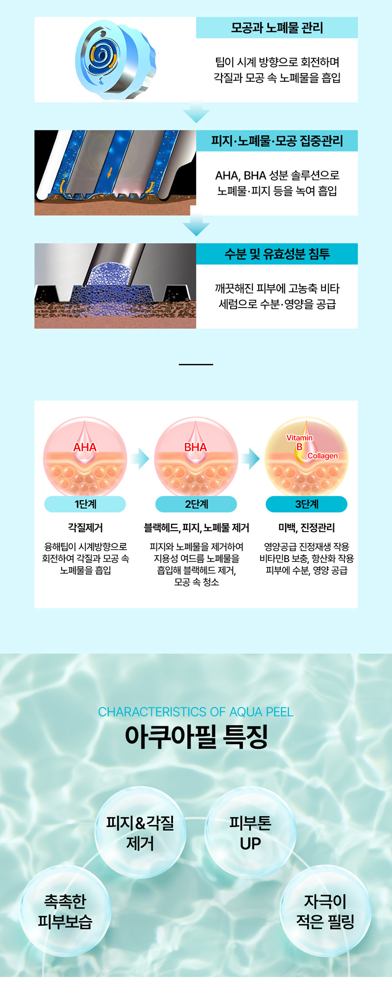 아쿠아필은 물리적 자극을 최소화하면서 물 분사와 진공 흡입, 필링 용액을 동시에 활용하는 관리입니다.